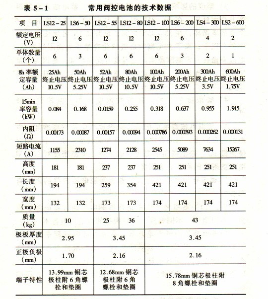 電池的內(nèi)阻就單體電池而言,主要由電解液、隔板和極板本身(極柵及活性物質(zhì))構(gòu)成。就電池組而言,單體電池之間的連接,以及極柱都是構(gòu)成電阻的重要部分,需進(jìn)行電壓降的計(jì)算。有時(shí)為了減小電壓降的損失,而采用銅芯鍍鉛的極柱。常用閥控電池的技術(shù)數(shù)據(jù)見表5—1。
